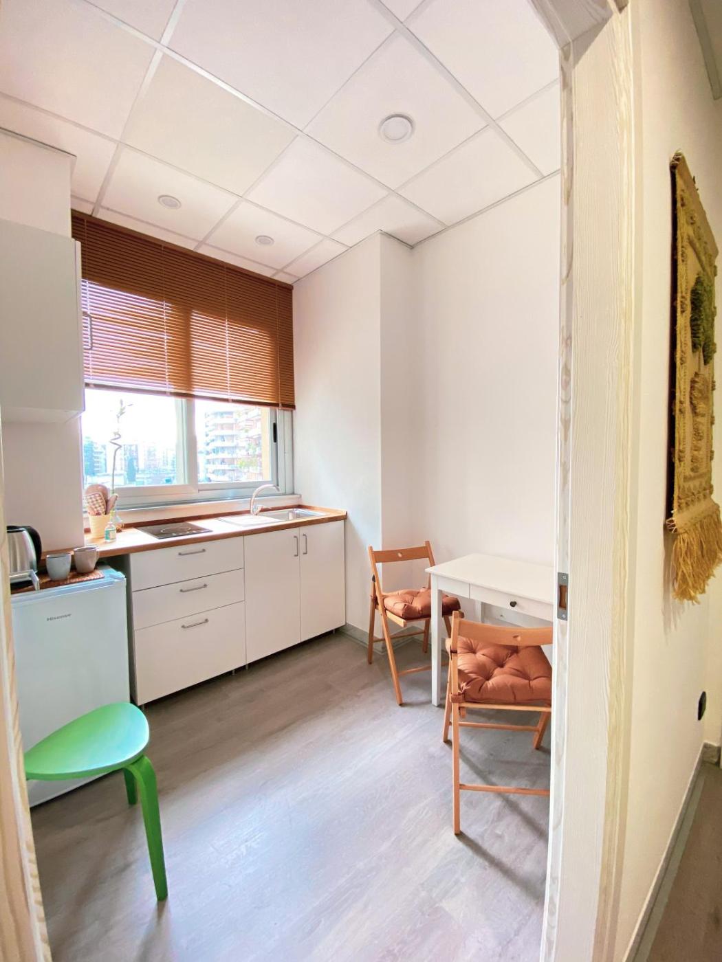 One-Bedroom Apartment. Boasting a private entrance, this air-conditioned apartment comes with a kitchen, 1 bedroom and 1 bathroom with a shower and a hairdryer. The fully equipped kitchen has a stovetop, a refrigerator, kitchenware and a tea and coffee maker. This apartment features a seating area, flat-screen TV, a quiet street view, as well as chocolate for guests. The unit has 2 beds.